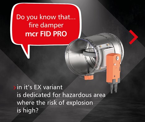 Cut-off dampers of fire resistance independent from direction of air flow and of installation side. Reduced acoustic noise and hydraulic resistance in the system due to reduction in thickness of the barrier. Click for more interesting facts about mcr FID PRO.